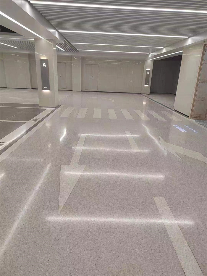 4.耐久性:环氧磨石地坪具有优秀的耐磨性和耐压性,可以承受较大的机械压力和磨损,适用于高流量和高负荷的区域,如商场、展览馆、车库等。