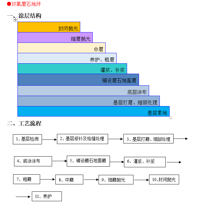 1.材料组成:环氧磨石地坪主要由环氧树脂、石英砂、颜料和其他辅助材料组成。石英砂是其中的主要成分,它赋予地坪涂层高强度和耐磨性。