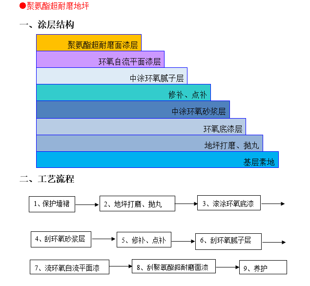 聚氨酯超耐磨免漆层、环氧自流平面漆层、中涂环氧腻子层、修补、点补、中涂环氧砂浆层、环氧底漆层、地坪打磨、抛丸、基层素地
